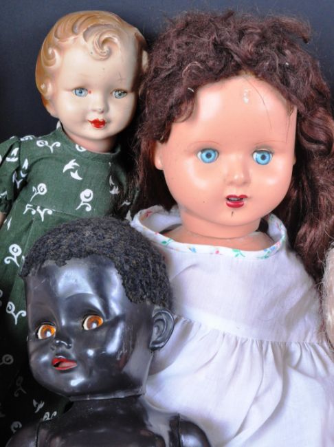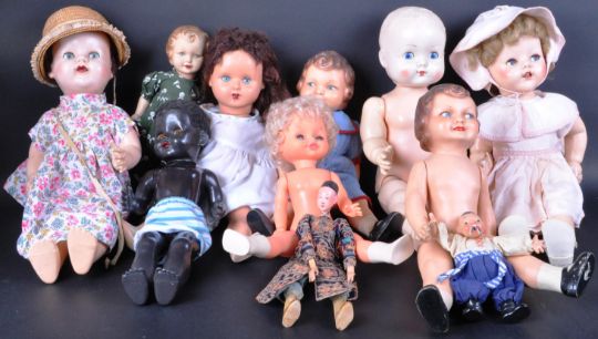 A collection of assorted vintage hard plastic and bisque headed dolls to include Pedigree dolls, Roddy doll, Italian Gadea doll and x4 bisque headed dolls. One marked to the back of the head F P 91. Largest doll to measure approx 50cm.