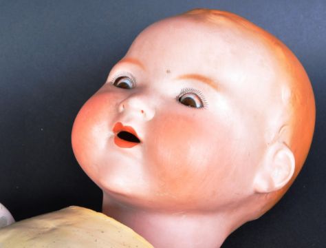 An early 20th Century German Armand Marseille bisque headed doll. The doll having brown flirty eyes, finely painted brows and lashes and open mouth. Marked to the back of the head A.M Germany 351 / 8K. The composition body, unattached.
