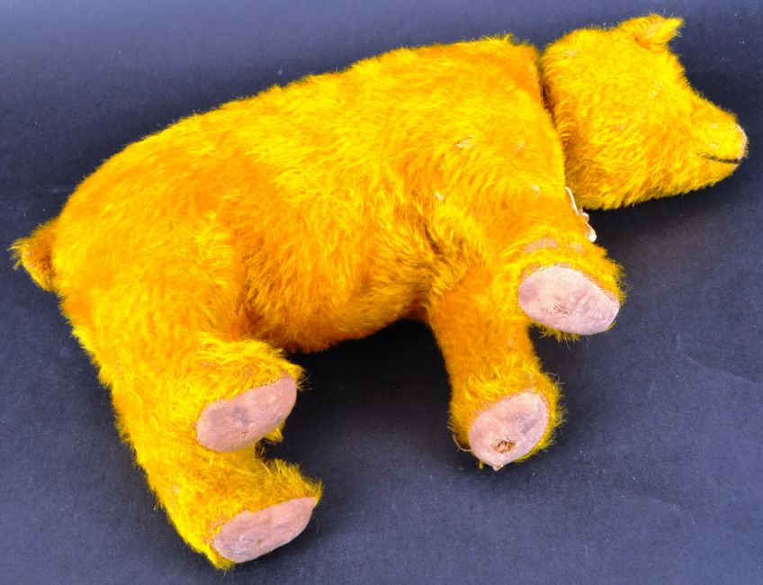 An early 20th Century believed Steiff made soft toy teddy bear. Golden mohair with black wooden eyes, stitched nose and articulated neck with ribbon. Likely once on wheels as a pull along toy. Measures approx 20x30cm