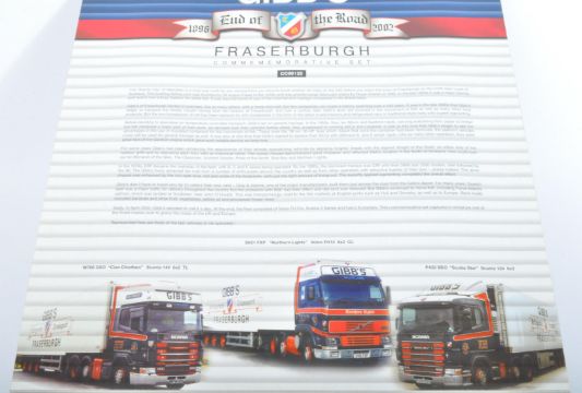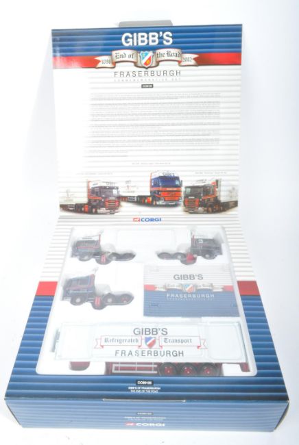 An original Corgi Limited Edition 1/50 scale boxed diecast set No. CC99125 ' Gibbs of Fraserburgh The End Of The Road ' commemorative set. The set containing x3 tractor units, fridge trailer and Limited Edition history booklet. Contents appearing mint.