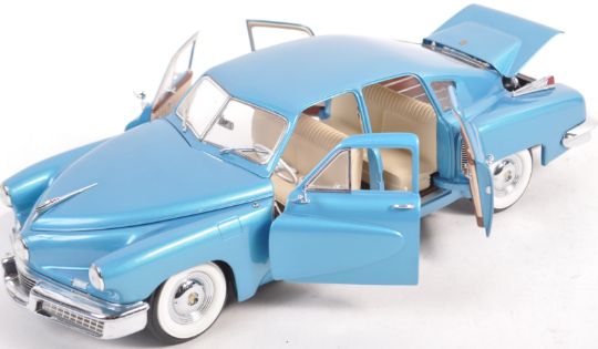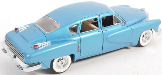 An original Japanese Kyosho made boxed 1/18 scale diecast model No. 08201B ' Tucker Torpedo '. The model appearing mint with fully opening doors, functioning steering wheel, front trunk with suitcase, jack and spare tyre. A highly detailed model within original box.
