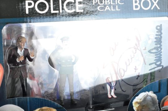 Doctor Who - Katy Manning (Jo Grant) and John Levene (Sergeant Benton) - autographed Eaglemoss ' Third Doctor Companion Set ' of action figures. Signed to the front by Manning and Levene in black ink, undedicated. Figure set unused, contents mint. Obtained in person, with certificate.