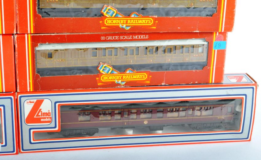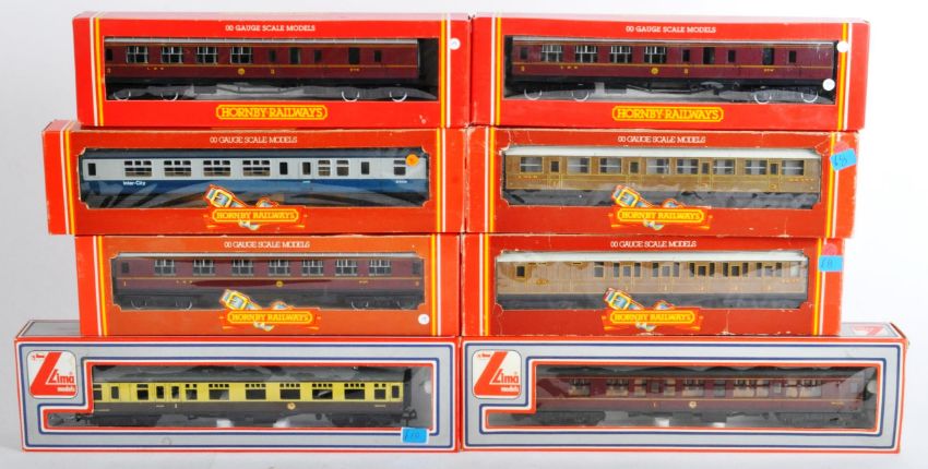 A collection of x8 assorted Hornby and Lima 00 gauge model railway trainset locomotive coaches and carriages to include; Lima 305312W Mk 1 CK Composite Corridor M25264 in BR maroon, TTR Twin Trix Railways BR chocolate and cream coach (in Lima box), Hornby R477 LNER Composite Coach teak finish, Hornby R418 BR Inter-City Coach MKII Brake 2nd and others.