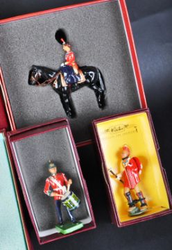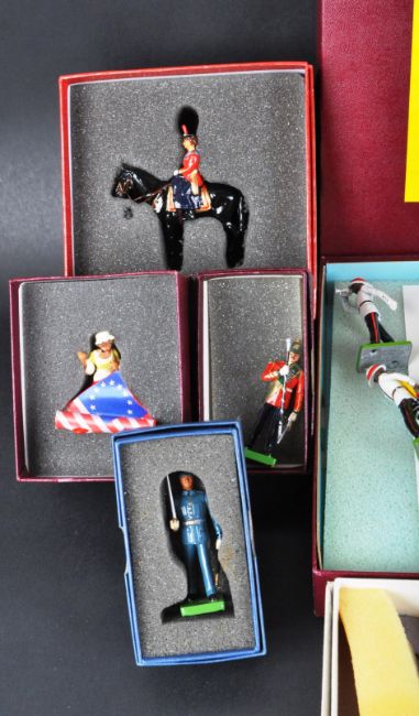 A collection of x9 assorted Britain's made lead toy soldier figures to include; 5187 The Bahamas Police Band, Israel Infantry, 5990 Betsy Ross, 5948 Black Hawk, 5862 The Sherwood Foresters Drum Major, 40197 ' The Hollow Cast Collection ' Her Majesty The Queen on Burmese and others. Detailed hand painted figures with boxes.
