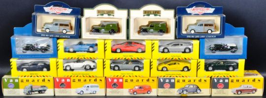 A collection of assorted boxed diecast model cars by makers Lledo Vanguards, Lledo Days Gone and Shell Super Car Collection. Examples to include Vanguards 1/43 scale VW Split Screen Vehicle, Royal Mail Austin 7 Mini Van, Lledo Days Gone Morris Minor Traveller, Shell Sports Car Jaguar XJS V12, Lotus E-Spirit and others. All contents appearing mint, within original boxes.