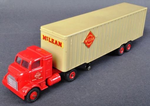 An original vintage Dinky Supertoys diecast model No. 948 ' Mclean Trailer-Tractor '. The model with cab windows and opening rear doors on the detachable trailer appearing VG+ within a VG original box.
