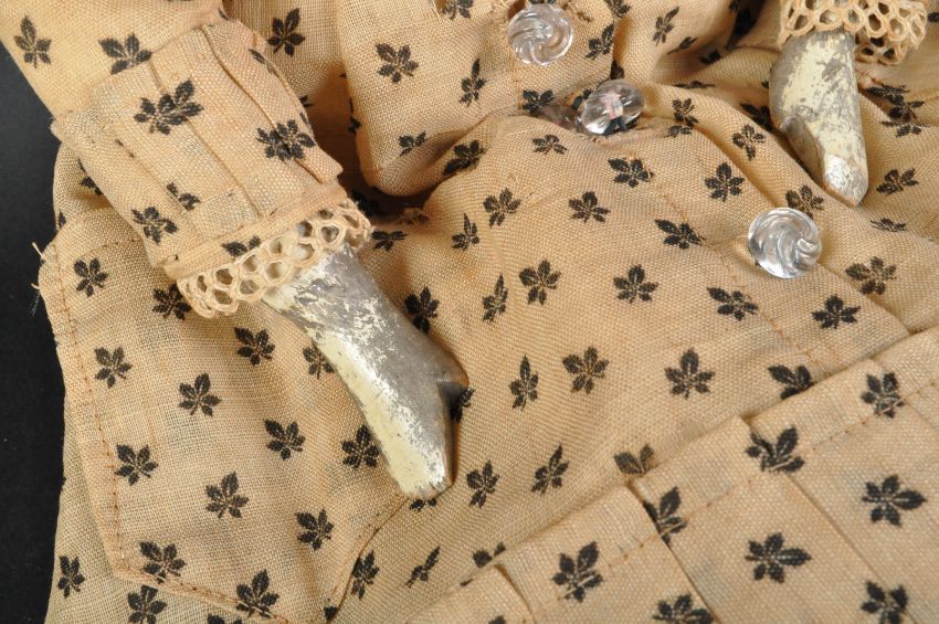 A large late 19th century Victorian ' Dutch ' peg doll - in the manner of Grodnertal / Grodner Tal. Wooden carved 'peg' limbs with articulated joints and a delicately painted rounded wooden face with blue eyes and red lips. Dressed in a period gown, with double layered petticoat. Measures approx 49cm.