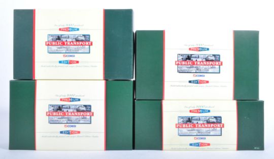 A collection of x4 Corgi Premium Edition 1/50 scale Public Transport models comprising; 33101 Smiths of Reading Dennis Lancet Coach, 34802 Sheffield Corporation Transport Leyland Weymann, 35009 Blackpool Transport AEC Routemaster and 33301 Southern National Bristol Duple Coach. Models appearing mint, with original boxes and outer sleeves.