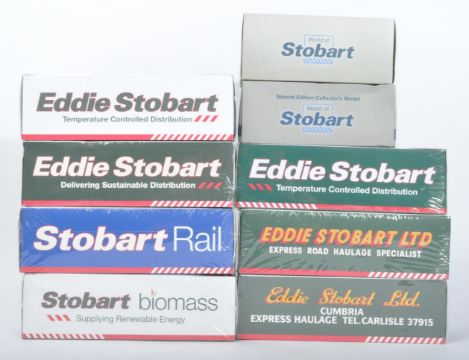 A collection of x9 assorted Atlas Editions 1/76 scale Eddie Stobart interest diecast model trucks and lorries to include; 134 Scania Topline Refrigerated Trailer, 136 Volvo FH Walking Floor Trailer, 124 Leyland DAF Curtainside. All models with inner display plinths and outer boxes. Some factory sealed.