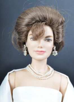 Two original Franklin Mint porcelain dolls comprising Princess Diana and Jackie Kennedy. Both dolls wearing cream white gowns with jewellery and tiara accessories. Mounted on original stands. Largest to measure approx 45cm.