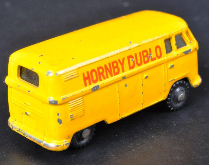 Two original vintage Dublo Dinky Toys diecast model vans comprising a yellow Volkswagen Camper Van and a red Royal Mail Van. Models appearing G / G+. Unboxed.