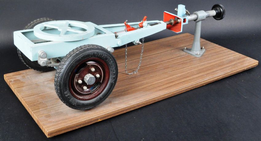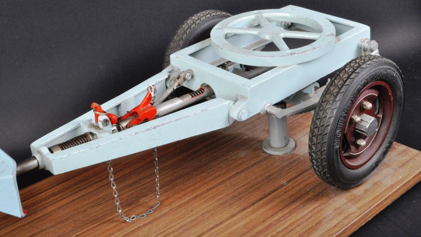 A vintage mid-20th century c1950s / 60s salesman's / engineers working model of a trailer / undercarriage. Highly detail large scale (possibly 1/12), with various moving parts. Likely made to showcase a new function or feature. Maker and provenance unknown. Highly detailed model. Mounted on a wooden base. Measures approx; 65cm long.