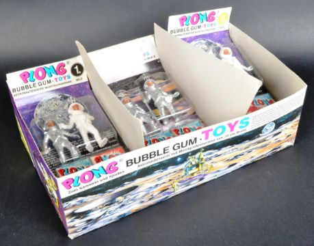 An original vintage German made ' Plong Bubble Gum ' ex-shop stock / countertop display box of ' Plong Bubblegum Toys '. The box featuring x9 assorted unopened Bubble Gum space / astronaut figures, each factory sealed on their card with bubblegum. The box decorated with various space scenes.