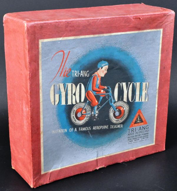 A mid-20th century vintage Lines Brothers / Tri-ang made ' Gyro Cycle ' tinplate toy. Litho-printed tin plate construction bicycle, with celluloid figure to top. Once the front wheel gyro is wound, the cycle continues upon it's way, with the figure appearing to pedal. Within it's original box, with original instructions. AF (front wheel comes loose). Measures approx; 19cm tall.
