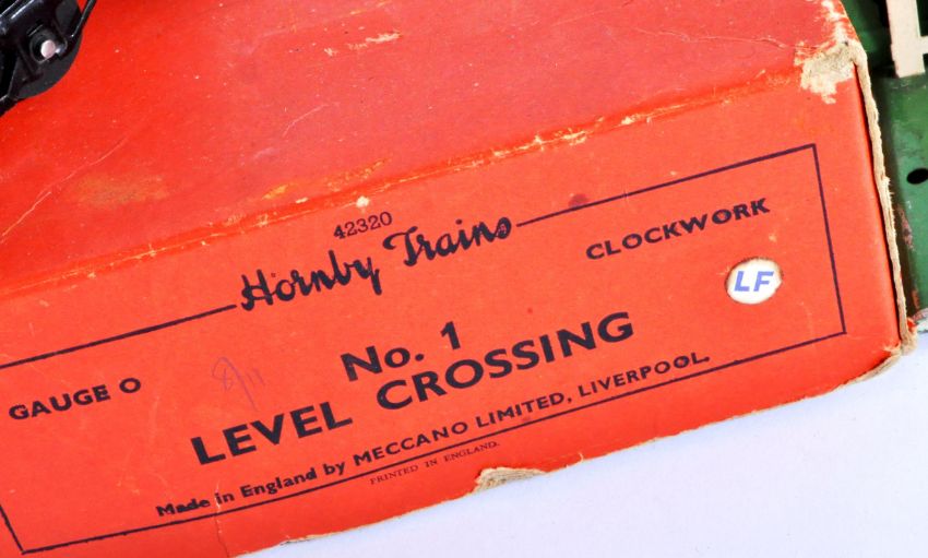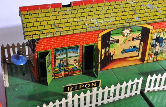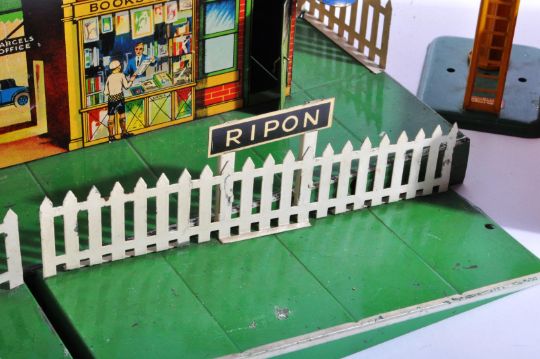 A collection of original vintage Hornby 0 gauge model railway trainset locomotive trackside accessories to include; Ripon Station platform with fence, Level Crossing, Platform Crane, Water Tank and a bogie well wagon.