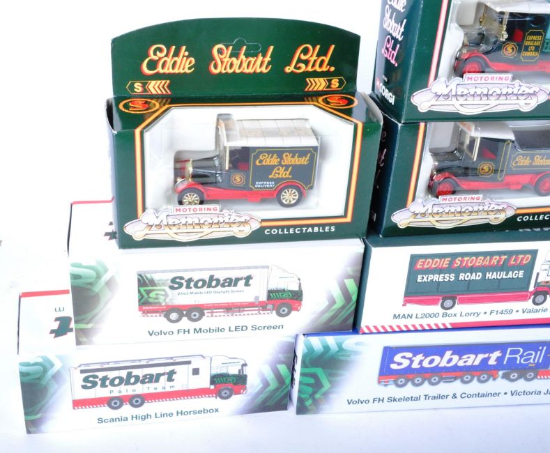 A collection of x10 assorted Corgi and Atlas Editions 1/76 scale Eddie Stobart diecast model trucks and lorries to include; 138 Stobart Rail  Volvo FH Skeletal Trailer & Container, 118 MAN L2000 Box Lorry, 108 Scania High Line Horsebox and others. All models appearing mint on inner display plinths and retaining original outer boxes.