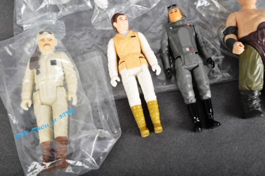 Star Wars - a scarce original 1980s Palitoy made Star Wars Woolworths ' Special Buy - 8 Star Wars Figures for 99p ' baggie set. The figures comprising: Admiral Ackbar (no baggie), Speeder Bike Pilot (sealed Kenner baggie, with blaster), Princess Leia Organa - Hoth Outfit (no baggie), Rancor Keeper (no baggie, no accessories), ATAT Commander (no baggie), Greedo (factory sealed in Made In Hong Kong baggie, with blaster), Rebel Soldier (in Made In Hong Kong baggie, with rifle), and FX-7 (in Made In Hong Kong baggie). Retains the original Woolworths bag with original label taped to exterior. Towards the end of production, such 'overstock' figures from the Palitoy factory were bundled into Special Buy bags and sold in quantities of 8. Sometimes weapons were present, other times not, sometimes figures were bagged but some were loose. From a genuine childhood collection. All baggie figures mint and untouched, the unbagged ones being very near mint to mint. Rare piece of Star Wars toy history.