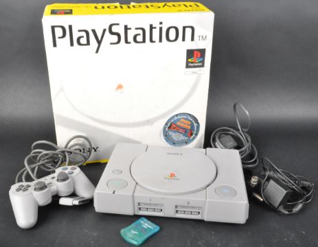 An original vintage Sony made PSOne Playstation 1 SCPH-5502 boxed video game console. The box containing the console, x1 controller and AC power cord adaptor. Untested.