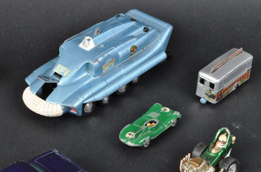 A collection of assorted vintage diecast model cars to include; Dinky Toys Captain Scarlet Spectrum Pursuit Vehicle and Maximum Security Vehicle, Corgi Toys U.N.C.L.E Oldsmobile Super 88, Proteus Campbell Bluebird, Quartermaster Dragster, Lesney No. 74 Mobile Canteen, No 41 D Type Jaguar and a Matchbox Superfast No. 66 Mazda RX 500. Conditions generally Good+