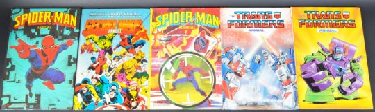 A collection of x15 vintage Marvel Superheros and other comic book annuals to include; The Transformers, Action Force, Spiderman, Ghostbusters and more. Hardback books with colour illustrations.