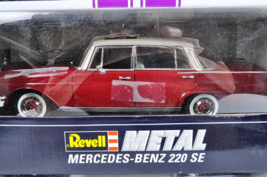 A collection of x4 assorted large scale boxed diecast model cars to include; Revel Metal 1/18 scale 08942 Mercedes Benz 220 SE, Diamond Wheels 1/18 scale Chevrolet Impala, Welly / Nex Models 1/24 scale 22417W 1965 Chevrolet Impala SS 396 and Jada Toys / Bigtime Kustoms 99551 1963 Cadillac. Highly detailed models within original boxes.