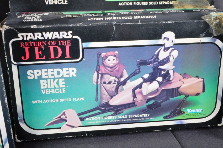 Star Wars - a collection of x5 original vintage Kenner / Palitoy made action figure playsets - mostly minirigs. Comprising: One Man Sail Skiff (complete, Tri-Logo box), Ewok Assault Catapult (complete), Tri-Pod Laser Cannon Toy (complete), AST-5 (complete) and a Speeder Bike Vehicle (missing just 1x flap). All within the original Return Of The Jedi boxes. No instructions.
