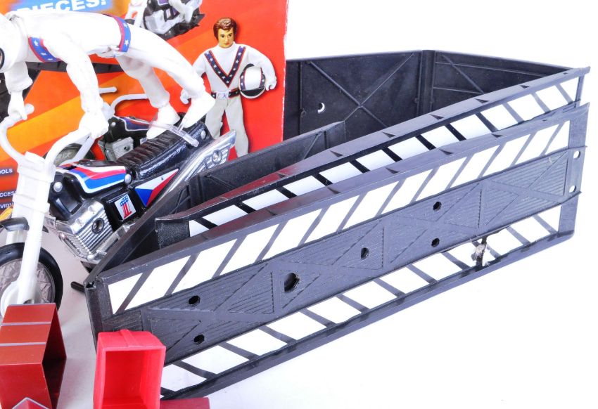Evel Knievel - a 2006 Flair made ' Deluxe Dare Devil Stunt Set ' playset, based on the classic 1970s version by Ideal. Appears partially unused, with many accessories still attached to their sprue. Boxed, with all inner packing. Likely complete, but is unchecked. Along with some loose items from another set - some appearing to be vintage (the ramp dated 1973 Ideal) - includes x2 extra motorcycles and Evel Knievel figures.