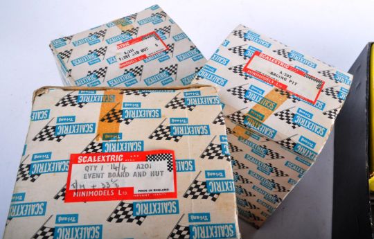 Large collection of assorted vintage Triang / Tri-ang Scalextric slot racing cars, controllers and trackside accessories. The collection to include Event Board and Hut, Racing Pit, x5 assorted cars, x6 controllers and a selection of spectators, barriers, and other trackside pieces.