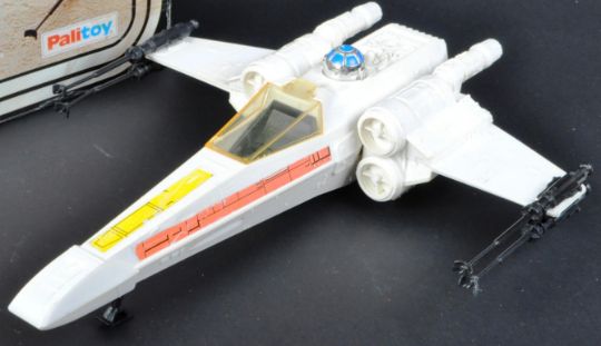 Star Wars - an original vintage 1977 first-issue Palitoy made Star Wars action figure playset ' X Wing Fighter '. Compete with all four side guns, canopy, and working wing action. Housed in its original first issue box (restored to one end). Vehicle appears generally VG to VG+, and is still very white.