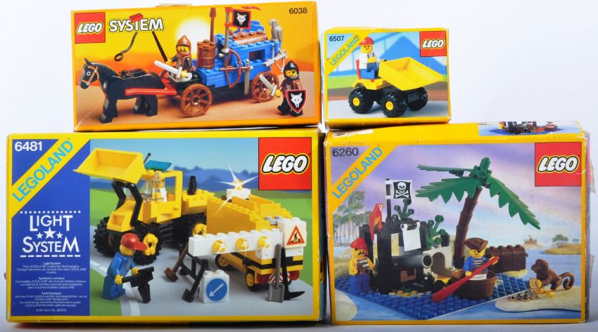 Lego Sets - Legoland and Lego System - 6038 / 6260 / 6507 / 6481 - a collection of x4 original vintage boxed Legoland and Lego System sets comprising sets No. 6038 Wolf Pack Renegades, 6260 Shipwreck Island, 6507 Mini Dumper and 6481 Construction Crew. All sets with instructions present are believed complete but remains unchecked.