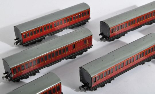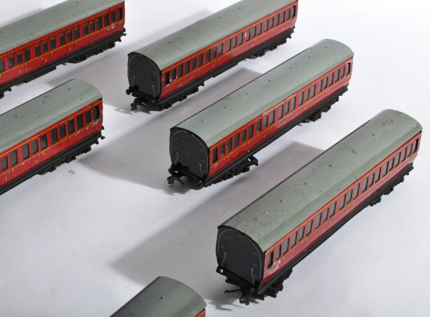 A collection of x10 vintage Hornby 00 gauge model railway trainset locomotive tinplate coaches / carriages. British Railways maroon livery.