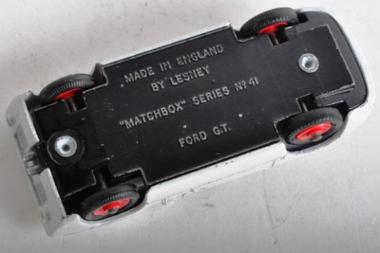 A Matchbox Lesney unboxed diecast model car ' Matchbox Series No. 41 Ford GT. White body, with No.6 decal, scarce red hubs and black plastic tyres. Model appearing good+.