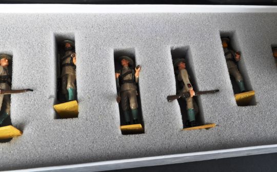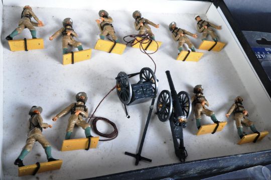 A large collection of assorted lead toy soldier figures to include Rank & File 0014 Royal Navy Landing Party, 0006 Royal Naval Field Gun & Crew Boer War, Britain 31061 American Civil War Union Cavalry Trooper, 25045 US 101st Airborne Infantry, Corgi CC51708 US Army Command Car and others. Detailed hand painted figures with original boxes.