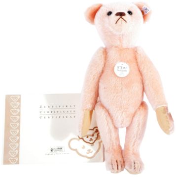 A Limited Edition German Steiff made soft toy teddy bear 408557 1908 Replica bear with growler. A light pink mohair example with black eyes, stitched nose and jointed limbs. Gold button and white tag to the left ear. Limited Edition of just 3000 pieces. Measures approx 35cm.