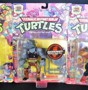 A collection of x4 original TMNT Teenage Mutant Ninja / Hero Turtles 25th Anniversary carded action figures compirising; Rock Steady, Bebop, April O'Neil and Splinter. Unsure if they are factory sealed.