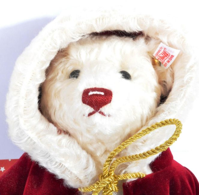 Two original Limited Edition German Steiff made Christmas soft toy teddy bears with certificates. Bears comprising 037665 Silent Night Musical Bear and 037580 White Christmas Bear. Both bears dressed in red and maroon velvet festive outfits with bells. Each to measure approx 32cm.