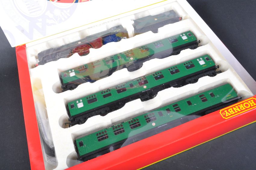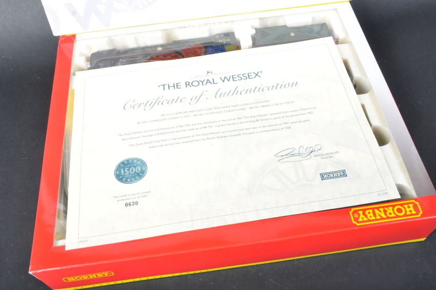 An original Hornby 00 gauge model railway trainset locomotive pack No. R2599M The Royal Wessex Train Pack. The set having a British Railways 4-6-2 Lamport & Holt Line Merchant Navy Class locomotive and x3 carriages. Contents appearing mint, with original box and certificate.