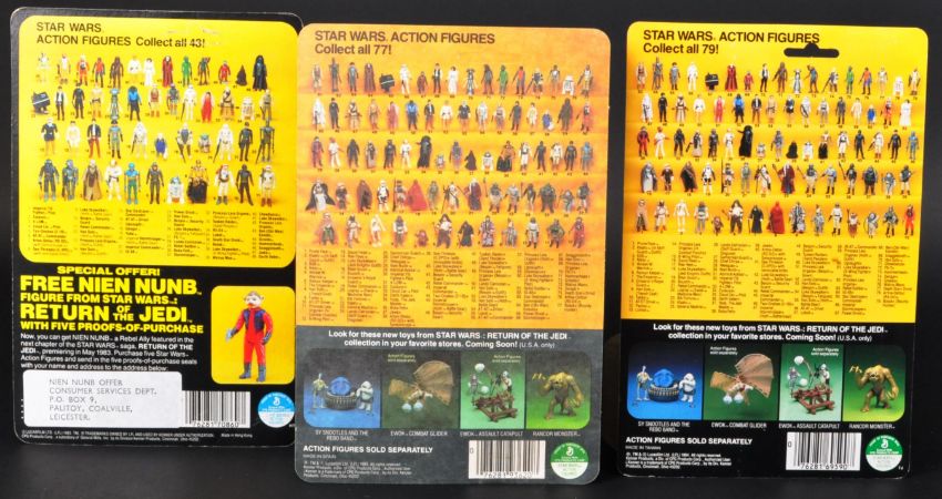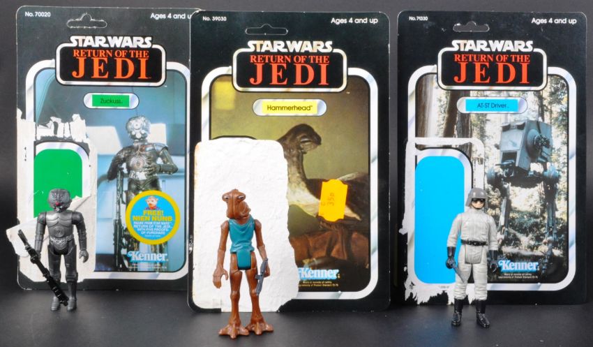 Star Wars - a collection of x3 original vintage Kenner made Star Wars action figures. All from Return Of The Jedi. Comprising: Hammerhead (GMFGI 1978 no COO), AT-ST Driver (LFL 1984 Taiwan), and Zuckuss (LFL 1982, no COO). All with their original weapons, and original ROTJ card backs. From a genuine childhood collection.