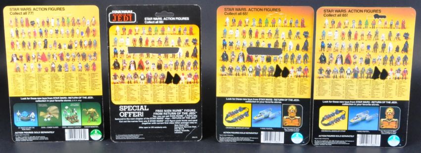 Star Wars - a collection of x4 original vintage Kenner made Star Wars action figures. All from Return Of The Jedi. Comprising: Klaatu (LFL 83 no COO), Weequay (LFL 83 no COO), Squid Head (LFL 1983 Made In HK COO), and Emperor's Royal Guard (LFL 1983 Made In Taiwan). All 100% complete with weapons. Condition generally NM to M. All supplied with their original Return Of The Jedi card backs. From a genuine childhood collection.