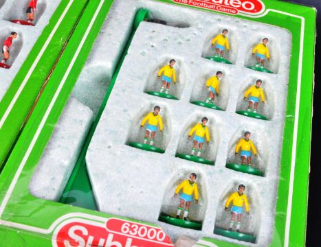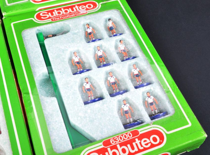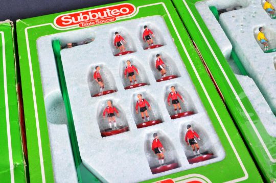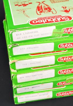 A collection of x6 original vintage Subbuteo 63000 tabletop football sets to include; 619 Liverpool, 653 England, 629 Tottenham Hotspur, 624 Southampton, 410 Brazil and 569 England. Contents appearing complete, within original boxes.