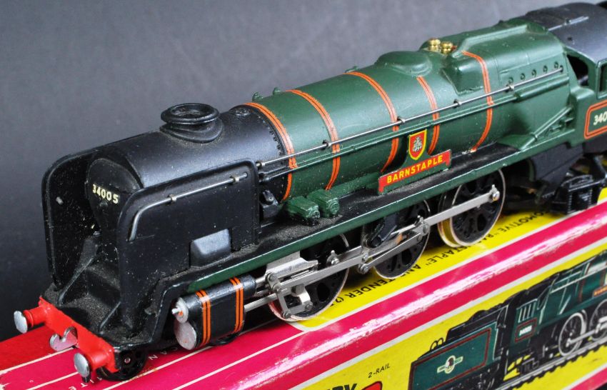 An original vintage Hornby Dublo 00 gauge model railway trainset locomotive engine No. 2235 4-6-2 S.R West Country locomotive ' Barnstaple ' with tender (2-Rail). Model appearing mint, with original box and paperwork.