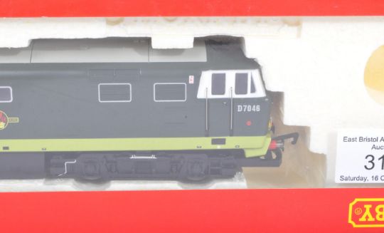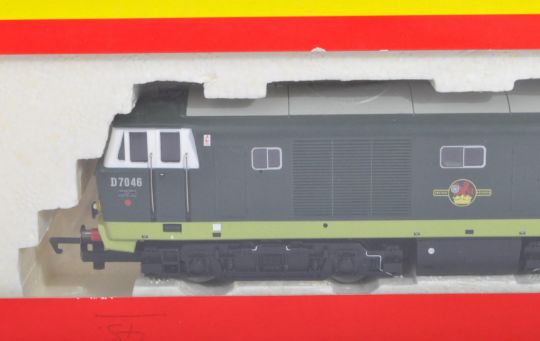An original Hornby 00 gauge model railway trainset locomotive diesel engine No. R2410 Class 35 Hymek D7046 in British Railways 2 tone green. Model appearing mint, within original box.