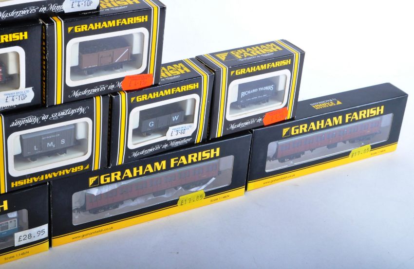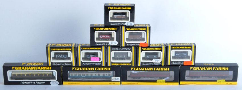 A collection of x12 original boxed Graham Farish N gauge model railway trainset locomotive rolling stock wagons and coaches / carriages. Examples to include No. 374-819MK1 FO First Open Coach, 2115 South Leicester Plank Wagon, 2301 LMS Single Vent Van, 2201 LMS Mineral Wagon and others. All models appearing mint, within original boxes.