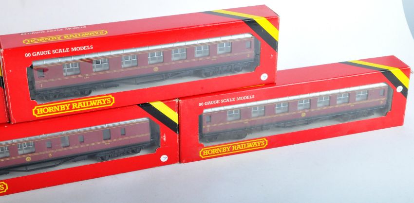 A collection of x8 boxed vintage Hornby 00 gauge model railway trainset locomotive coaches and carriages. All LMS Composite and Brake coaches in maroon livery. Contents appearing mint, within original boxes.