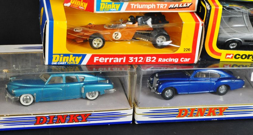 A collection of x9 assorted vintage Corgi Toys and Dinky Toys diecast model cars to include; Dinky Toys 226 Ferrari 312/B2 Racing Car, 207 Triumph TR7 Rally, 152 Rolls-Royce Phantom, Corgi Toys 343 Ford Capri, 418 London Taxi and others. All models within their original boxes.