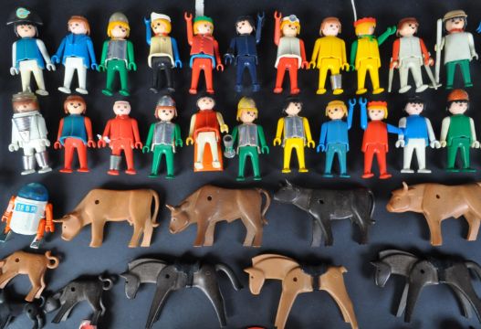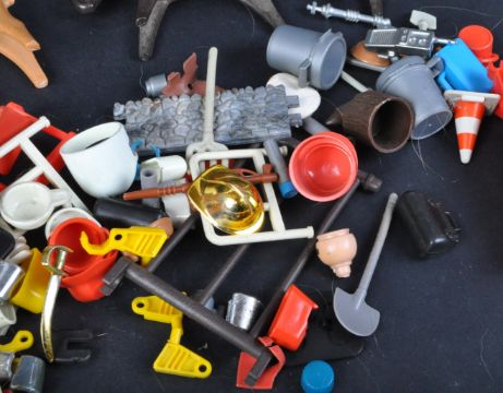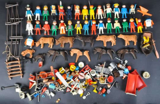 A large collection of assorted vintage 1970's Playmobil playpeople figures and accessories. Largely Town People along with Space, Police, Knights, Horses and other smaller accessory pieces.