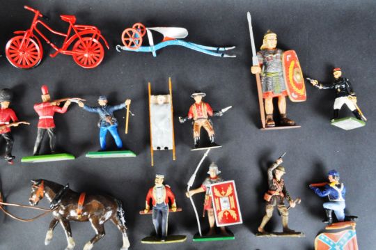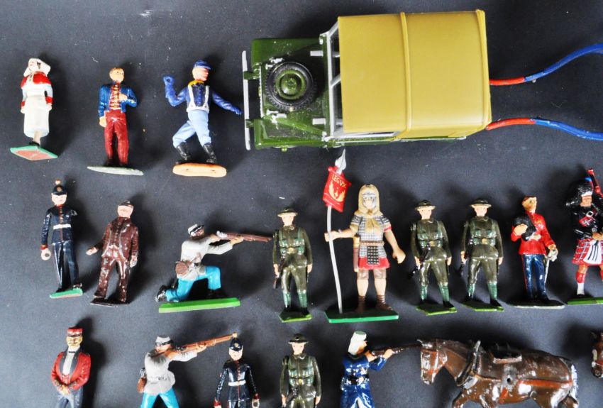 A large collection of assorted lead and plastic toy soldier figures. Largely Britain's made but some others present. Examples to include WWI and WWII soldiers, Infantry Foot Guards, Knights, Horses, Cowboys and Indians, Gladiators others.
