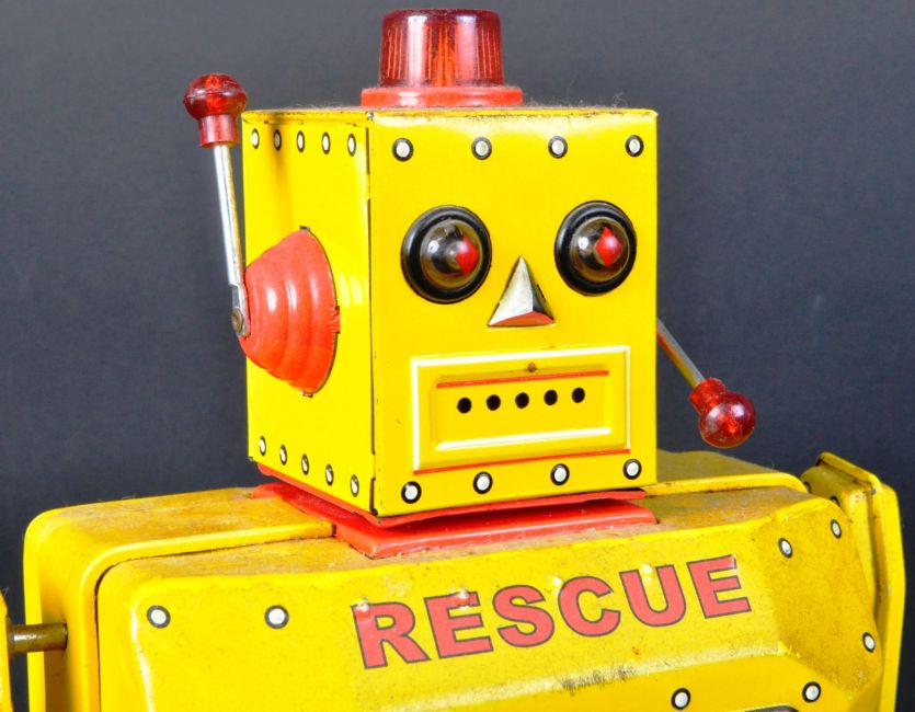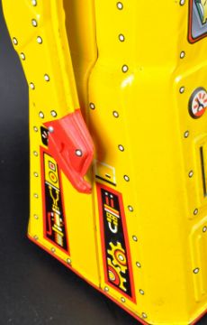 An original vintage ' Rocket USA ' made R-1 / Robot One battery operated tinplate robot with ' bump n go ' action and flashing lights. Measures approx 33cm.