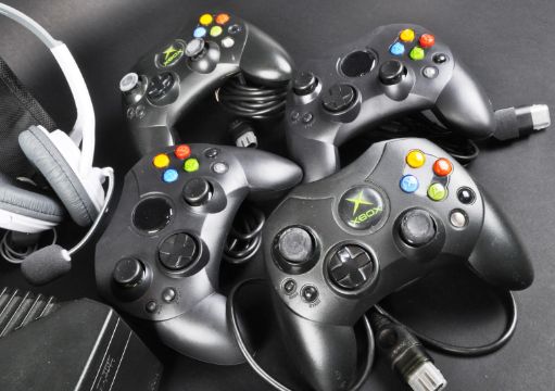 An original Microsoft Xbox video games console with x4 controllers (x2 official first party controllers and x2 third party) power and audio video leads, gaming headset, 8mb flash memory card and an ALS Industries carry bag to house it all inside. The official controllers thumb sticks are fairly worn due to age however the face buttons appear in good condition.