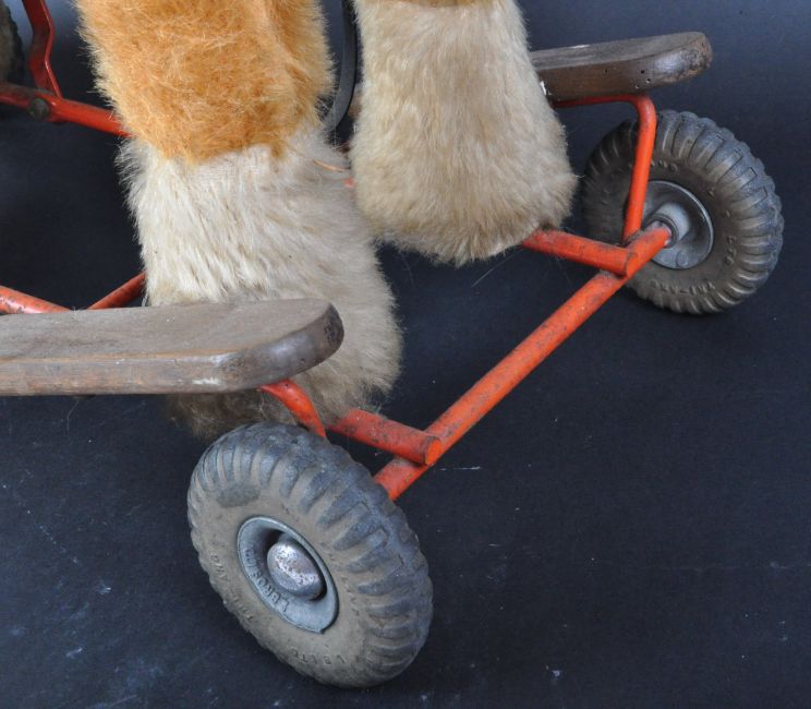An original vintage Lines Bros of Ireland ( Triang / Tri-ang ) ride along / push along horse. Light brown mohair with a white tail and mane with bridle and reins. Original Lines Bros label to the under side.